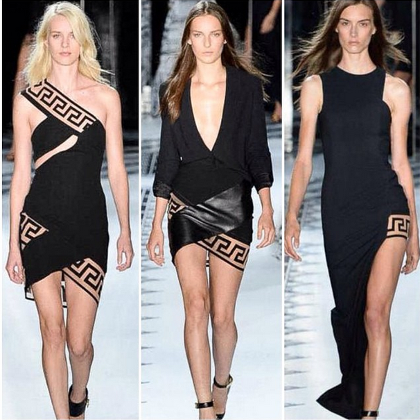 The line featured black and white prints, conveying a classic Versace feeling. One of our favorites was the Grecian key motif that made an asymmetric trim on little black wrap dresses. There was some of Gianni’s old black magic in a lattice of leather, knitted together with gold.