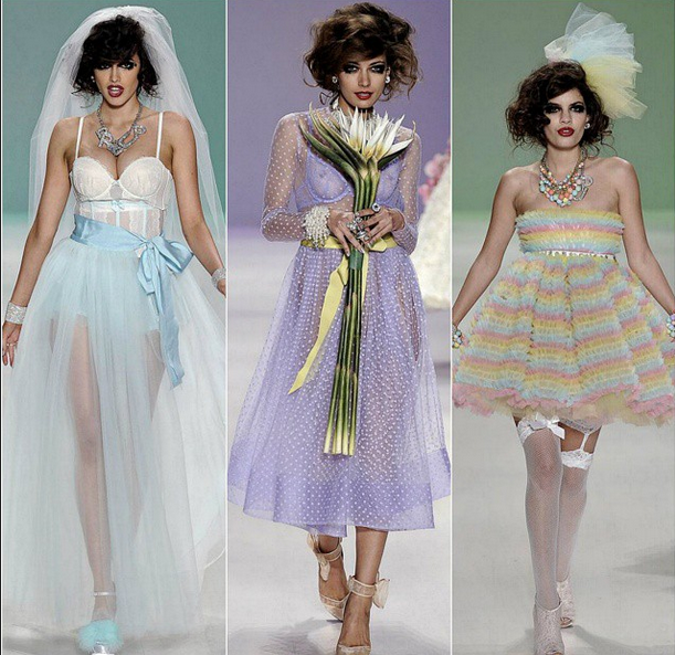 Highlighting her growing bridal business, designer Betsey Johnson’s ‘Love and Marriage’ themed Spring/Summer 2015 hit the runway for New York Fashion Week. Johnson stayed true her design aesthetic boasting trendy and wearable pieces for brides-to-be and their wedding parties such a shirt dress, a crop top with ‘prenup’ embossed with rhinestones and a sequined tux for the fellas.