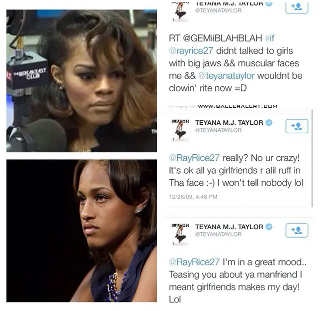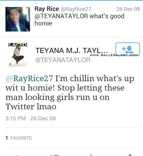 which resulted in the couple arguing the night of the elevator incident. Baller Alert shared a number of screen shots of Tweets (from 2012 and 2013) between the two. In one Twitter conversation, it appears that Teyana is poking fun of Ray’s then girlfriend, Janay.