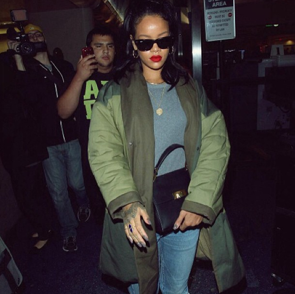 A casually dressed Rihanna hits JFK airport in Isabel Marant jacket and Ray Ban shades.