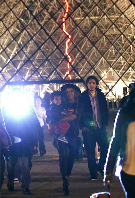 The Carters are enjoying their time off the road. On Tuesday (October 7th), we spotted Beyonce, Jay Z and Blue Ivy in Paris. Scarcely surrounded by a few photogs, the trio — along with the family’s body guard — visited The Louvre Museum. [Sidebar — we’ve never been so, we googled it –> The Louvre or the Louvre Museum is one of the world’s largest museums and a historic monument. A central landmark of Paris, France, it is located on the Right Bank of the Seine in the 1st arrondissement.]