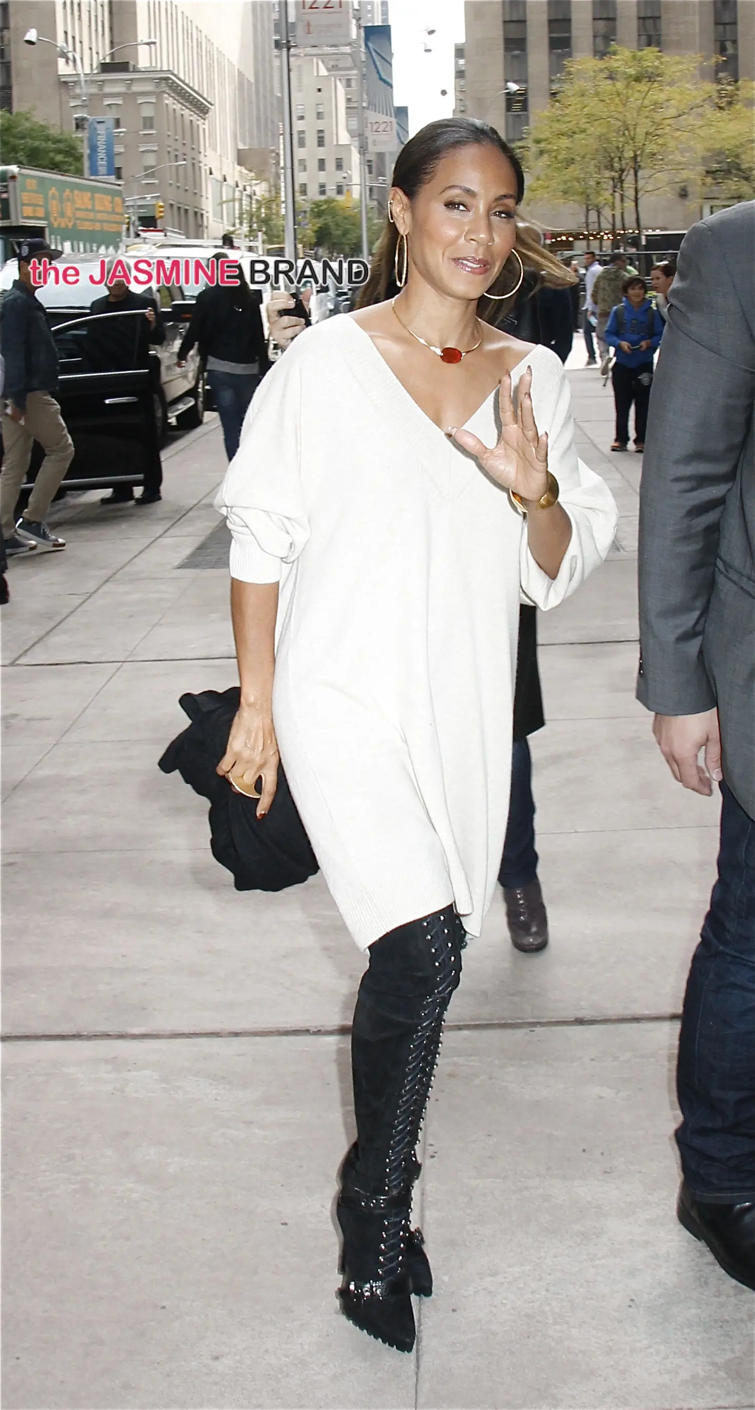 Wearing a long white sweater and black thigh-high boots, actress Jada Pinkett-Smith arrives at SiriusXM studios in NYC. Jada is currently promoting the new series, Gotham.
