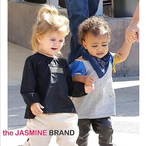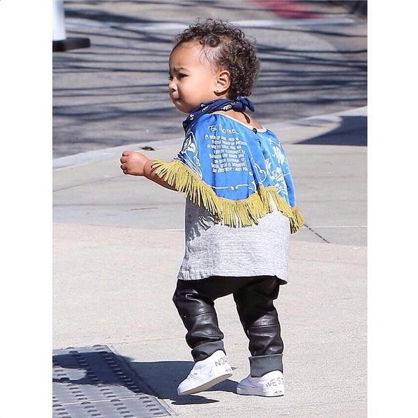 Over the weekend, North West made an adorable appearance. Wearing leather pants, white Vans (customized with her first and last name) blue bandana and cowboy style caped/shirt, she was accompanied by her famous parents Kanye West and Kim Kardashian. Kim’s very pregnant sister, Kourtney, was also present, along with her two children, Mason and Penelope.