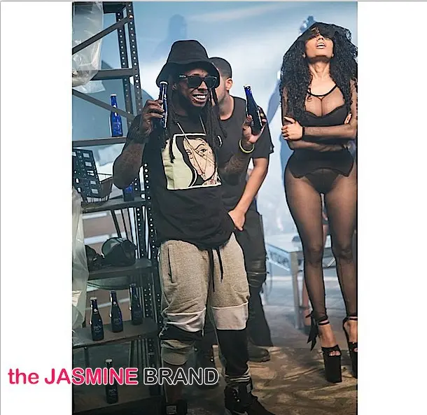 Rocking black lingerie, Minaj poses alongside Drizzy (who also opts for black) and a casually dressed Lil Wayne.