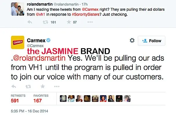 VH1’s new reality show, Sorority Sisters, is more controversial than we thought. As previously reported, the non-scripted show has received some backlash. This week, Carmex — a VH1 advertiser — announced that it would not be advertising with the network. Their reason? Apparently, their customers have voiced their concerns about the show. In a reply to news correspondent Roland Martin, the brand’s verified Twitter account wrote: