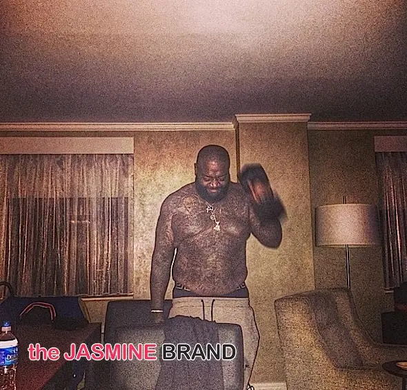 A melting Rick Ross, lifts a few weights chest-naked for Instagram.