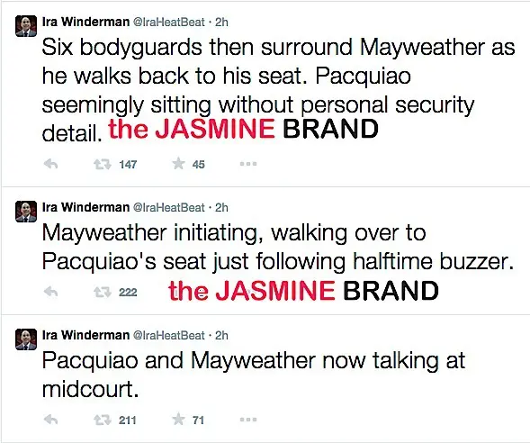 At halftime, the two met at half court, shaking hands and having a polite conversation that ended with the two exchanging numbers. According to Pacquaio, this was his first time ever speaking to Mayweather.