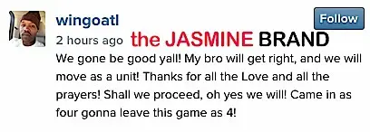 We gone be good yall! My bro will get right, and we will move as a unit! Thanks for all the Love and all the prayers! Shall we proceed, oh yes we will! Came in as four gonna leave this game as 4!