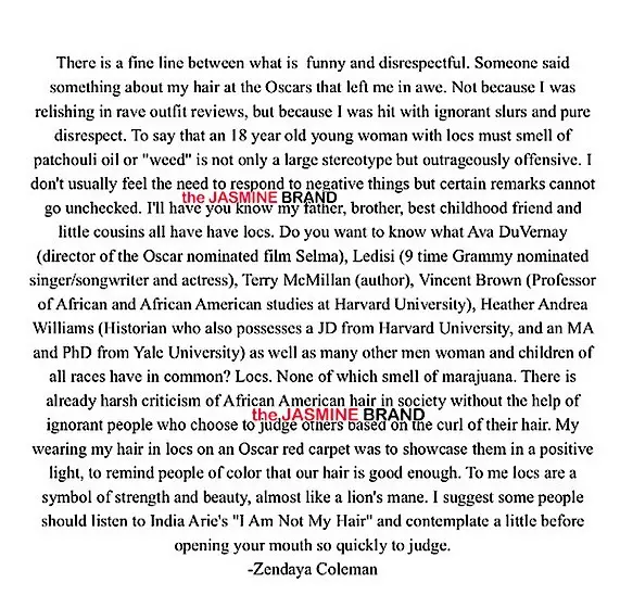 To say that an 18 year old young woman with locs must smell of patchouli oil or ‘weed’ is not only a large stereotype but outrageously offensive. None of which smell like weed. There is already a harsh criticism of African American hair in society without the help of ignorant people who choose to judge others based on the curl of their hair. My wearing my hair in locs on an Oscar red carpet was to showcase them in a positive light, to remind people of color that our hair is good enough.