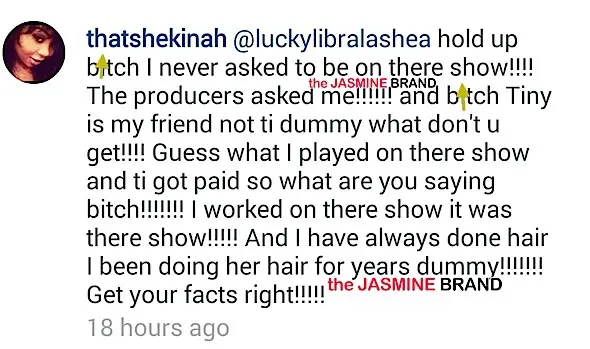 hold up b*tch I never asked to be on there show!!! The producers asked me!!! and b*tch Tiny is my friend not ti dummy what don’t u get!!! Gues what I played on there show and ti got paid so what are you saying b*tch!!!!! I worked on there show it was there show!!! And I have always done hair I been doing hair for years dummy!!!! Get your facts right!!!!
