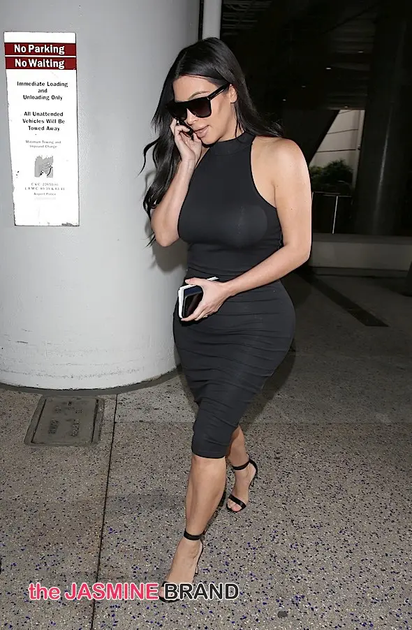 The Keeping Up With the Kardashians star wore a sleeveless fitted black dress and black open-toe heels, as she chatted on the phone in the airport, as she flew in from Brazil. Kim had traveled across the country to launch her new collection for C&A.
