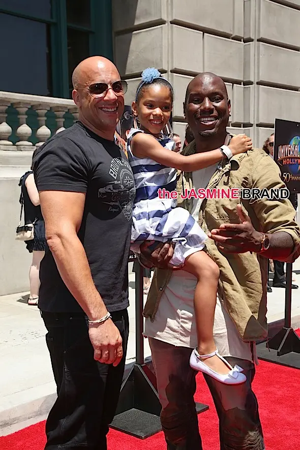 Vin Diesel, Tyrese Gibson, daughter Shayla Gibson attend the “Fast & Furious – Supercharged” ride premiere at Universal Studios Hollywood.