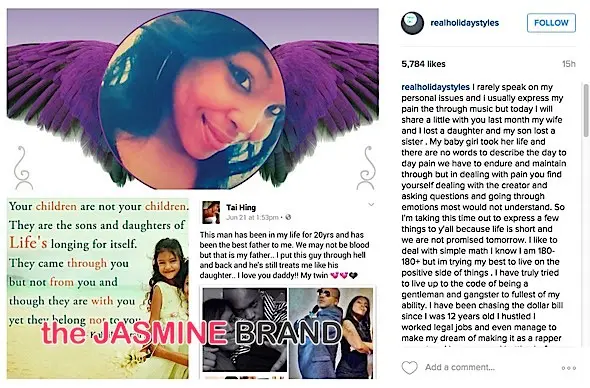 I have truly tried to live up to the code of being a gentleman and gangster to fullest of my ability. I have been chasing the dollar bill since I was 12 years old I hustled I worked legal jobs and even manage to make my dream of making it as a rapper come true I have popped bottles before it was the thing to do , I have owned beamers, benzos , rovers, trucks etc etc etc I have lived in the ritz ,owned condos , houses traveled a lot of places etc etc etc but I can honestly tell you don’t none of that sh*t add up or equal to love!! I have lost my brother , father , aunt , grandmother in law and too many good friends/ brothers and now my daughter!!!! But the only thing that can be done is to leave it in the creators hands .
