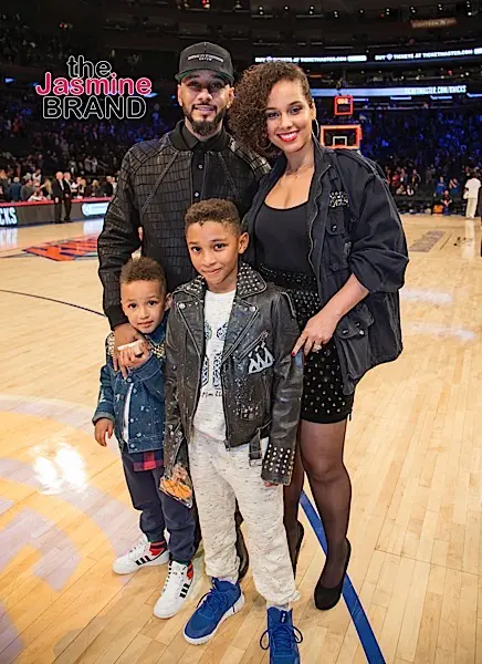 Alicia Keys with her husband Swizz Beatz and their son Egypt and his brother Kaseem pose for a photo after the New York Knicks play the Miami Heat at Madison Square Garden.