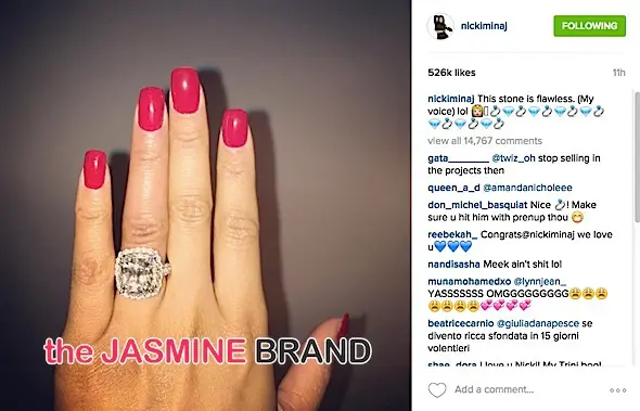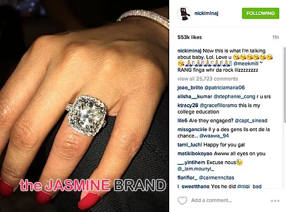 Nicki Minaj received a massive diamond ring for her 33rd birthday, from her boyfriend rapper Meek Mill. She shared the photo of her new bling on Instagram, with the caption: