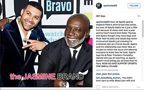 Over all Apollo said he respects Peter’s drive & business sense, but over all Apollo states he is just a little hurt because it’s been well over a year and he hasn’t heard from Peter Thomas and Apollo thought they were boys and Peter had his back and would stay down.#nolovelost! Apollo just showing his emotional side as a friend should. Apollo said the relationship was never fake on his part so what’s the issue with allowing everyone to know how he feels. Apollo says his & Peter Thomas’s friendship started with you all watching, so Apollo doesn’t mind letting you all know how he feels. NOW GO AND SUPPORT SPORTS ONE BAR & LOUNGE