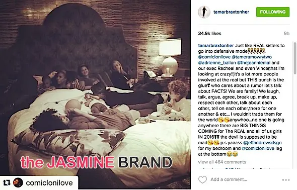 Just like REAL sisters to go into defensive mode???????????? @comiclonilove @tameramowrytwo @adrienne_bailon @thejeanniemai and our exec Racheal and even Vince(that I’m looking at crazy!!)It’s a lot more people involved at the real but THIS bunch is the glue? who cares about a rumor let’s talk about FACTS! We are family! We laugh, talk, argue, agree, break up, make up, respect each other, talk about each other, tell on each other,there for one another & etc… I wouldn’t trade them for the world????????anywhoo…no one is going anywhere there are BIG THINGS COMING for The REAL and all of us girls IN 2016?? the devil is supposed to be mad???????? p.s yaaass @jeffandrewsdsgn for my bedroom and @comiclonilove leg at the bottom????????