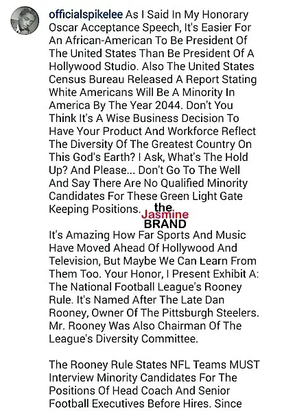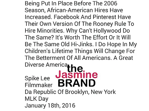 #OscarsSoWhite… Again. I Would Like To Thank President Cheryl Boone Isaacs And The Board Of Governors Of The Academy Of Motion Pictures Arts And Sciences For Awarding Me an Honorary Oscar This Past November. I Am Most Appreciative. However My Wife, Mrs. Tonya Lewis Lee And I Will Not Be Attending The Oscar Ceremony This Coming February. We Cannot Support It And Mean No Disrespect To My Friends, Host Chris Rock and Producer Reggie Hudlin, President Isaacs And The Academy. But, How Is It Possible For The 2nd Consecutive Year All 20 Contenders Under The Actor Category Are White? And Let’s Not Even Get Into The Other Branches. 40 White Actors In 2 Years And No Flava At All. We Can’t Act?! WTF!! It’s No Coincidence I’m Writing This As We Celebrate The 30th Anniversary Of Dr. Martin Luther King Jr’s Birthday. Dr. King Said “There Comes A Time When One Must Take A Position That Is Neither Safe, Nor Politic, Nor Popular But He Must Take It Because Conscience Tells Him It’s Right”. For Too Many Years When The Oscars Nominations Are Revealed, My Office Phone Rings Off The Hook With The Media Asking Me My Opinion About The Lack Of African-Americans And This Year Was No Different. For Once, (Maybe) I Would Like The Media To Ask All The White Nominees And Studio Heads How They Feel About Another All White Ballot. If Someone Has Addressed This And I Missed It Then I Stand Mistaken. As I See It, The Academy Awards Is Not Where The “Real” Battle Is. It’s In The Executive Office Of The Hollywood Studios And TV And Cable Networks. This Is Where The Gate Keepers Decide What Gets Made And What Gets Jettisoned To “Turnaround” Or Scrap Heap. This Is What’s Important. The Gate Keepers. Those With “The Green Light” Vote. As The Great Actor Leslie Odom Jr. Sings And Dances In The Game Changing Broadway Musical HAMILTON, “I WANNA BE IN THE ROOM WHERE IT HAPPENS”. People, The Truth Is We Ain’t In Those Rooms And Until Minorities Are, The Oscar Nominees Will Remain Lilly White. (Cont’d)