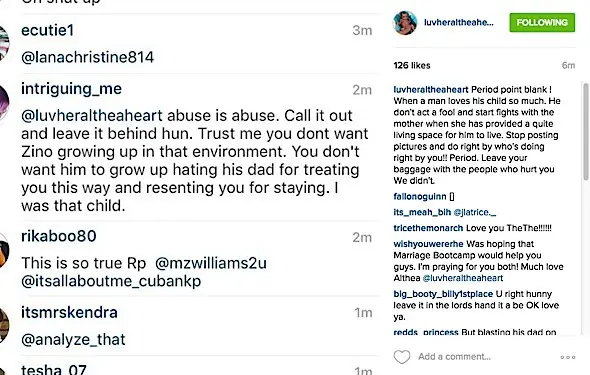 Obviously, Althea (which happens to be my name) had no one to teach her what a man is. Then she got with a man, who by her own words “is a Coke Head” and abuses her, rather verbally or emotionally and then airs it out on IG. Maybe she needs to take time out and think about her son’s future. Money and the little fame she has is not worth a lifetime of regrets and if could of, would of. She’s not married to Zino and that in itself is a blessing! Run don’t walk to Jesus and get yourself together. I know, I been there and I am so glad, I stopped, looked and listened.