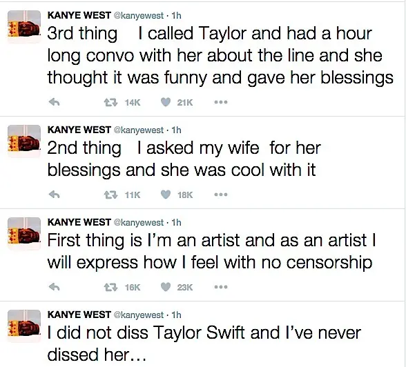 Kanye did not call for approval. But to ask Taylor to release his single ‘Famous’ on her Twitter account. She declined and cautioned him about releasing a song with such a strong misogynistic message. Taylor was never made aware of the actual lyric, ‘I made that bitch famous’.