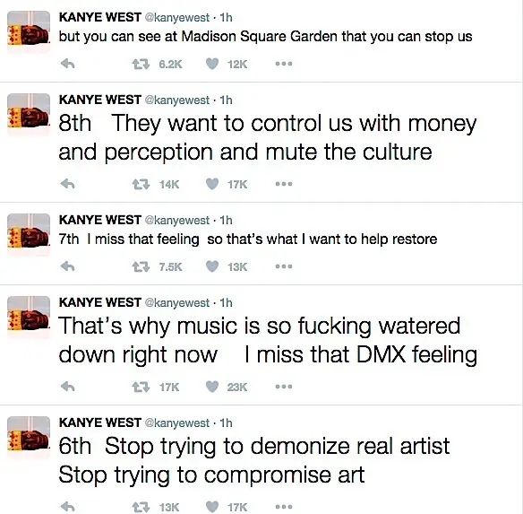 Fresh off of debuting his new album, The Life of Pablo, Kanye West is livid with some of the criticism he’s received thus far. In particular, folk have called him out for some of the lyrics that he’s used toward Taylor Swift. Some also aren’t a fan of how he referred to wife Kim Kardashian as ‘b*tch’ on another track (click here to listen). On Friday morning, Kanye hopped on Twitter, venting and numbering his thoughts. Check ’em out below.