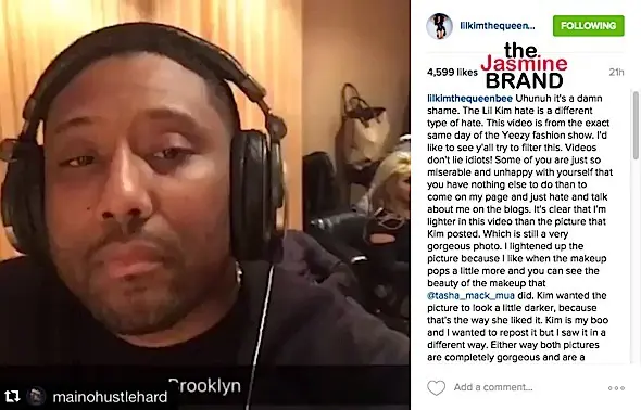Lil Kim is responding to criticism that she’s lightening her skin and/or filtering her photos. In particular, she’s received backlash over a photo that she took with Kim Kardashian at Kanye West’s Yeezy 3 fashion show/listening session. Kim took to Instagram, with the following explanation on Instagram: