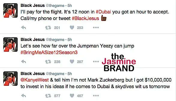 The Game has responded to Kanye’s financial need, offering $10 million. But there’s a catch, Ye must meet the rapper in Dubai, skydive with him and bring a pair of his infamous sneakers.