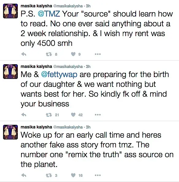 Masika Kalysha (real name Masika Tucker) is denying reports that she’s demanding a paternity test from the father of her unborn child, Fetty Wap. Today, a story began to circulate that she has filed legal documents stating that she wants to the rapper to cover child support and pregnancy expenses. Check out her tweets below: