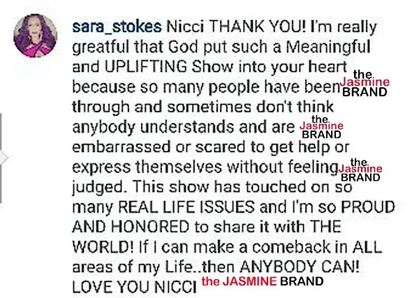 Update #2. theJasmineBRAND.com has exclusively located an Instagram comment of Sara, thanking one of the show’s creators/producers, Nicci Gilbert. In in the comment, Sara seems to be appreciative of the show.
