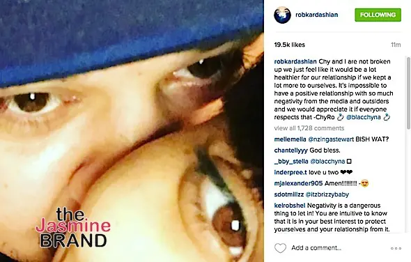 Chy and I are not broken up we just feel like it would be a lot healthier for our relationship if we kept a lot more to ourselves. It’s impossible to have a positive relationship with so much negativity from the media and outsiders and we would appreciate it if everyone respects that -ChyRo ? @blacchyna ?