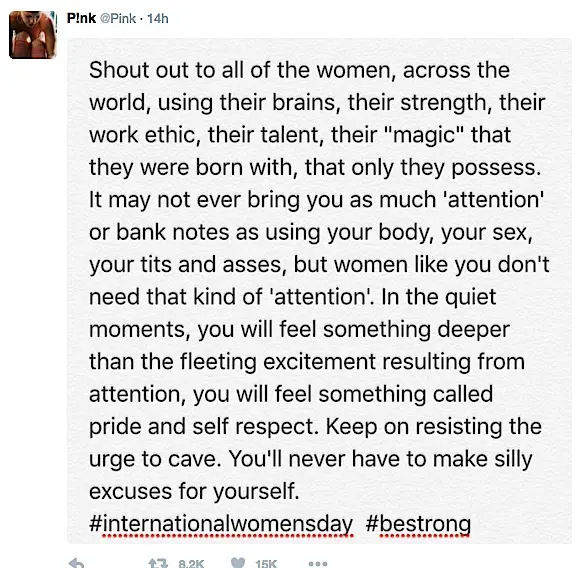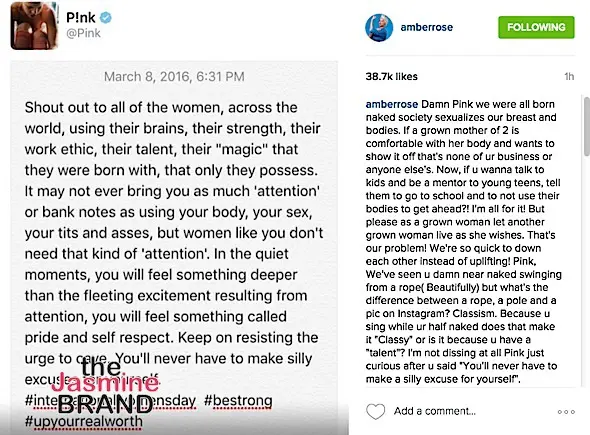Damn Pink we were all born naked society sexualizes our breast and bodies. If a grown mother of 2 is comfortable with her body and wants to show it off that’s none of ur business or anyone else’s. Now, if u wanna talk to kids and be a mentor to young teens, tell them to go to school and to not use their bodies to get ahead?! I’m all for it! But please as a grown woman let another grown woman live as she wishes. That’s our problem! We’re so quick to down each other instead of uplifting! Pink, We’ve seen u damn near naked swinging from a rope( Beautifully) but what’s the difference between a rope, a pole and a pic on Instagram? Classism. Because u sing while ur half naked does that make it “Classy” or is it because u have a “talent”? I’m not dissing at all Pink just curious after u said “You’ll never have to make a silly excuse for yourself”.