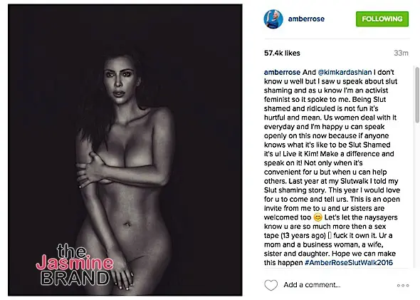 Amber also posted an open letter of sorts, defending Kim and asking her to participate in her next Slut Walk. She writes: