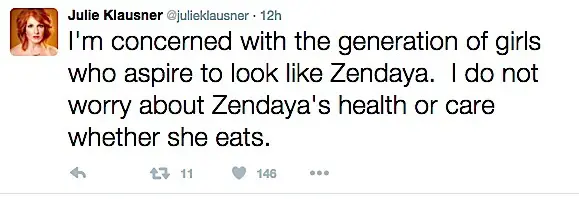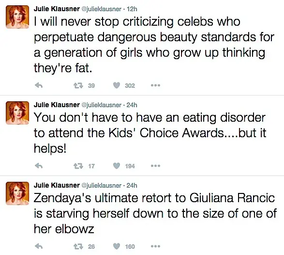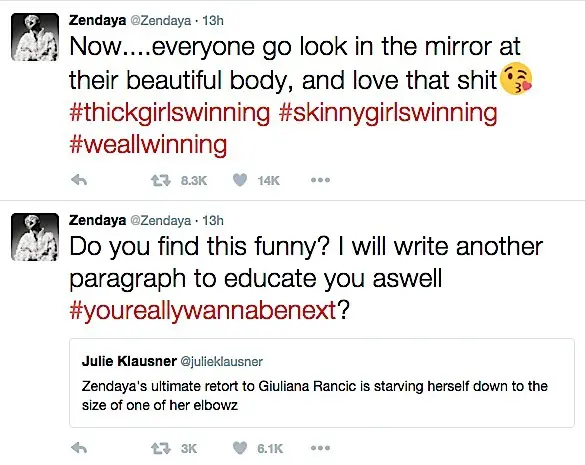 Over the weekend, Zendaya Coleman found herself in a Twitter tussle of sorts, after she was called out on social media for being too thin. Just one day after Zendaya attended the Kids Choice Awards, Difficult People star Julie Klausner took to Twitter, criticizing Zendaya’s weight.