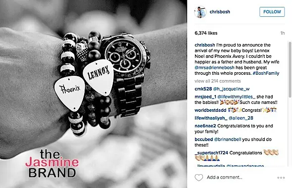 Congrats to Christopher Bosh and Adrienne! This week, the Miami Heat player and wife welcomed twins boys named Lennox and Phoenix. Chris shared the news on Instagram with the caption: