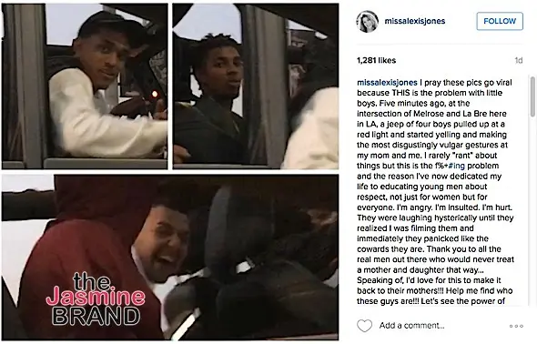 I pray these pics go viral because THIS is the problem with little boys. Five minutes ago, at the intersection of Melrose and La Bre here in LA, a jeep of four boys pulled up at a red light and started yelling and making the most disgustingly vulgar gestures at my mom and me. I rarely “rant” about things but this is the f%+#ing problem and the reason I’ve now dedicated my life to educating young men about respect, not just for women but for everyone. I’m angry. I’m insulted. I’m hurt. They were laughing hysterically until they realized I was filming them and immediately they panicked like the cowards they are. Thank you to all the real men out there who would never treat a mother and daughter that way… Speaking of, I’d love for this to make it back to their mothers!!! Help me find who these guys are!!! Let’s see the power of social media and hold them accountable. I’d LOVE to have a candid conversation with them about sexual harassment not simply to shame them, but to understand their mentality so we can better educate young men to be respectful in the future. #littleboys #cowards #realmenrespectwomen #messedwiththewrongchick #wewillfindyou @iamthatgirl