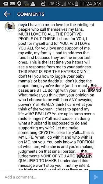 I have so much love for the intelligent people who call themselves my fans. MUCH LOVE TO ALL THE POSITIVE PEOPLE OUT THERE. I share for YOU, I post for myself and for YOU. And I LOVE YOU ALL for you love and support of me, my wife, my family. I had to address the fans first because they are the important ones. This is the last time you haters will see a response from me to your sadness. THIS PART IS FOR THE HATERS ONLY: I don’t tell you how to juggle your baby mama’s or baby daddy’s, I don’t judge the stupid things you’ve done (and in most cases are STILL doing) with your lives. What makes you think that your opinion on who I choose to be with has ANY swaying power? Y’all REALLY think I care what you think of the woman I chose to spend my life with? REALLY? You’re up in arms over a middle finger? Y’all mad cause I’m doing what a husband is supposed to do and supporting my wife? Let me make something CRYSTAL clear for y’all….this is MY LIFE. What I do with it and who with is on ME, not you. You only know a PORTION of who I am, who she is and you’re making judgments on that small portion, judgements NONE OF YOU ARE QUALIFIED TO MAKE. I understand this message won’t stop you….not my intent. As birds must fly and all that lives must die, HATERS MUST HATE. it’s just sad that you’re so miserable the only spot of joy you can get is down talking someone else’s happiness. My kids are WELL FED and taken care of, my wife is MY CUP OF TEA, meaning she don’t gotta be yours. But you’re entitled to feel whatever you want. You go ahead, continue wasting your time passing judgment and talking shit as if ANY of you sad and unhappy souls mean anything to us. You don’t….but you can keep believing you do.?