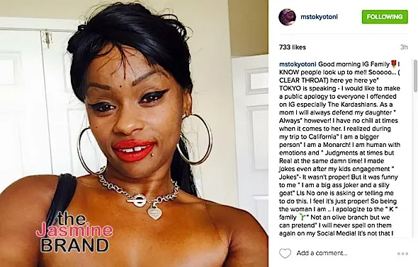 Good morning IG Family? I KNOW people look up to me!! Sooooo… ( CLEAR THROAT) here ye here ye” TOKYO is speaking – I would like to make a public apology to everyone I offended on IG especially The Kardashians. As a mom I will always defend my daughter ” Always” however! I have no chill at times when it comes to her. I realized during my trip to California” I am a bigger person” I am a Monarch! [sic] I am human with emotions and ” Judgments at times but Real at the same damn time! I made jokes even after my kids engagement ” Jokes”- It wasn’t proper! But it was funny to me ” I am a big ass joker and a silly goat” Lls No one is asking or telling me to do this. I feel it’s just proper! So being the woman I am .. I apologize to the ” K ” family ? ” Not an olive branch but we can pretend” I will never spell [sic] on them again on my Social Media! It’s not that I am bowing down .. Im just looking up! ” Follow my lead” Apologize to someone today! It can make a big difference in a life or situation! Xoxox Tokyo Toni! — Silly me ” I APPROVE THIS MESSAGE” ???. Any comments that are negative ” Blocked without a word spoken” OH IM LEARNING FAST ! @robkardashian and@blacchyna I love you kids with all my heart!! Headed back to MY CIty — DC with a positive outlook and a NEW SON IN LAW TO BE!! #khloekardashian#kimkardashian #krisjenner#kourtneykardashian – My bad ??