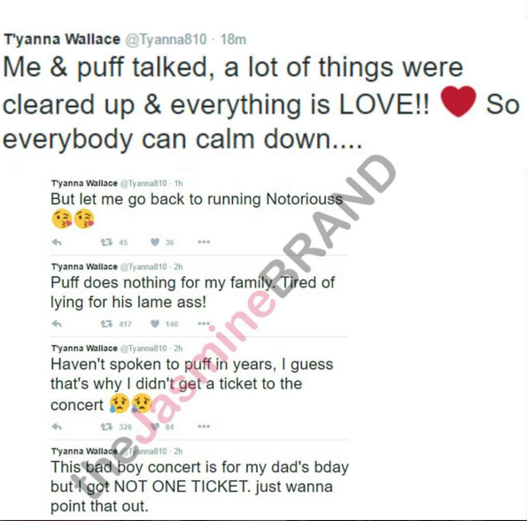Sean ‘Diddy’ Combs is speaking out about reports that T’yanna Wallace, the daughter of the late Notorious B.I.G., called him out publicly. As previously reported, T’Yanna sent a few scathing tweets in the direction of Diddy, claiming that she had not received tickets to the upcoming Bad Boy Reunion concert. She also noted that Diddy does very little for her family, before sharing that they two had ironed out their differences.