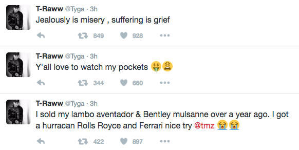 Tyga denies reports circulating that he owes a few coins for one of his luxury vehicles. This week, reports surfaced that the rapper who dates Kylie Jenner, owes over $300K for his Lambo Aventador. In fact they allegedly want to have the car repossessed. However, Tyga paints a different story. On Twitter, he writes: