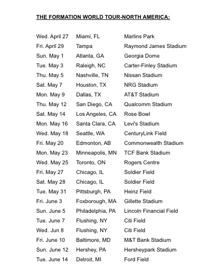United Way will have a presence on every tour stop, starting on the North American leg of the tour which kicks off on Wednesday, April 27 at Marlins Park in Miami, Florida. CHIME FOR CHANGE and Global Citizen will have their online activation program for fans in select tour markets, including Houston, Los Angeles, New York, Detroit and London. In addition, there are three signature charity events in three cities; Houston, TX, Compton, CA and Detroit, Michigan.