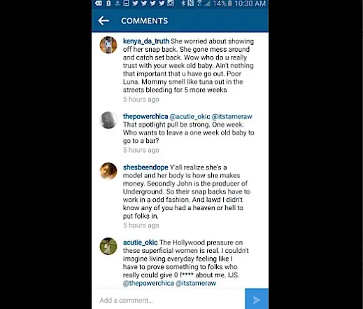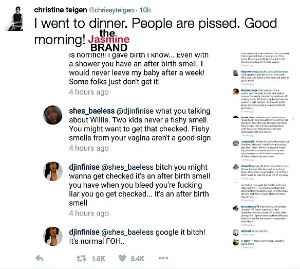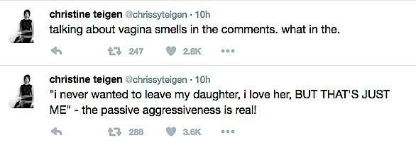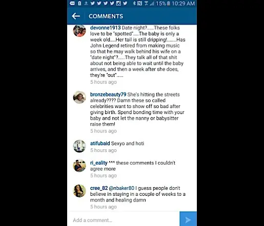 So what’s the big deal? A few folk on Twitter found it inappropriate that the super model was out so soon since having their daughter. See a few critics weigh in, along with Chrissy’s sarcasm below.