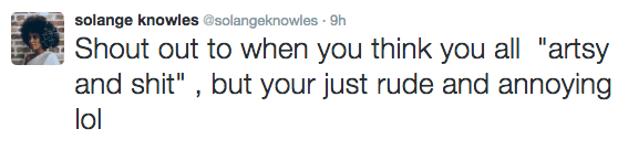 If there’s one thing that Solange Knowles is NOT biting, it’s her tongue — nor her Twitter fingers. While enjoying the festivities at the lavish Met Gala, the sister of Beyonce was apparently annoyed with someone. See the shady tweet below.