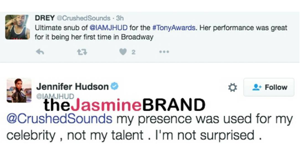 Does Jennifer Hudson feel a bit snubbed by for being left off the list for the Tony Awards nominations?