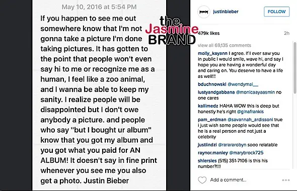In the words of Kanye West, ‘please no photos’. If you’re a Justin Bieber fan, you won’t be snapping a photo with him anytime soon. The singer says that he’s no longer taking photos with fans.