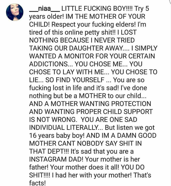 Nia claims to be older than Chris, but acts like a child with the above IG post. Everyone expects Chris to act like a fool and carry on like a child. Nia, take the high road and always act like a lady. Be an example for your daughter. Don’t allow this boy/man to steal your joy. He is very immature, but has show some growth since the baby. You on the other hand should not ever step out of the mature mother role. Cussing him out on social media is tacky. Now cussing him out is private is acceptable. lol