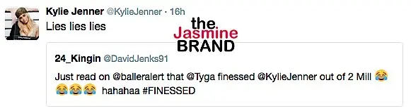 Allegedly, while they were in a relationship, Tyga had borrowed “over $2 million” from Kylie. Once they split, Kylie was allegedly begging for her to pay her back. However, Kylie says that simply is not true. In fact, on Twitter, she responded to someone writing: