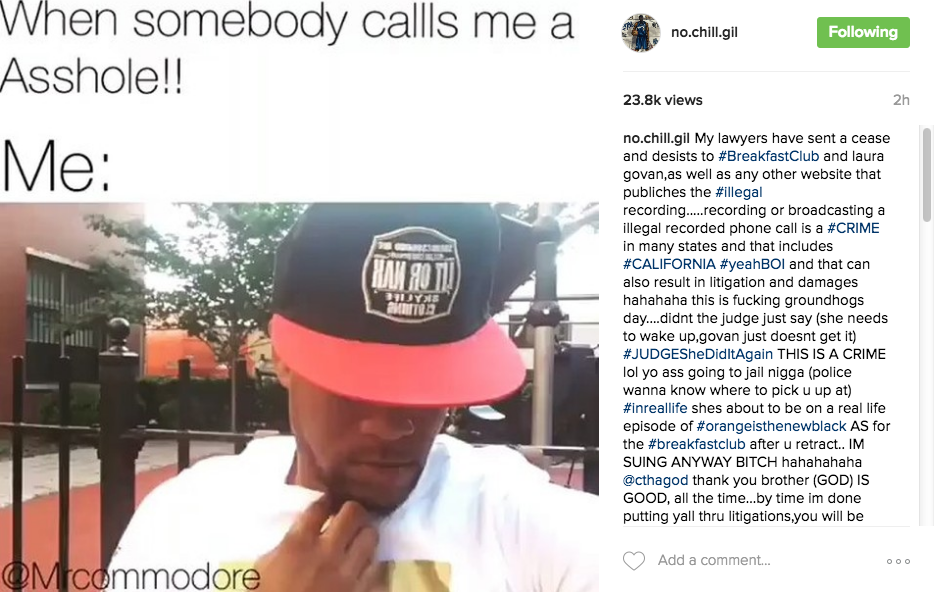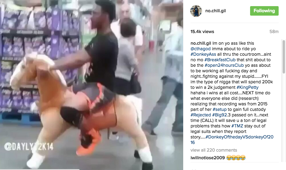 Im on yo ass like this@cthagod imma about to ride yo#DonkeyAss all thru the courtroom…aint no mo #BreakfastClub that shit about to be the #open24hoursClub yo ass about to be working all fucking day and night..fighting against my stupid…….FYI im the type of nigga that will spend 200k to win a 2k judgement #KingPettyhahaha i wins at all cost….NEXT time do what everyone else did (research) realizing that recording was from 2015 part of her #setup to gain full custody#Rejected #Big92.3 passed on it…next time (CALL) it will save u a ton of legal problems thats how #TMZ stay out of legal suits when they report story…..#DonkeyOfthedayVSdonkeyOf2016