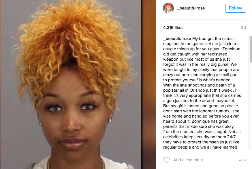 My boo got the cutest mugshot in the game. Let me just clear a couple things up for you guys . Zonnique did get caught with her registered weapon but like most of us she just forgot it was in her really big purse. We were taught in my family that people are crazy out here and carrying a small gun to protect yourself is what’s needed . With the late shootings and death of a pop star all in Orlando just this week , I think it’s very appropriate that she carries a gun just not to the airport maybe lol. But my girl is home and good so please don’t start with the ignorant rumors , she was home and handled before you even heard about it. Zonnique has great parents that made sure she was okay from the moment she was caught. Not all celebrities keep security on them 24/7 they have to protect themselves just like regular people and we all have learned even security can’t always protect you . Her mugshot is still cute as hell lol