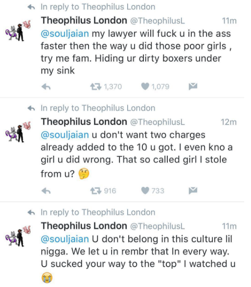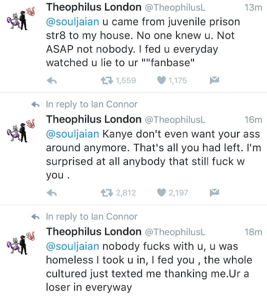 Today (June 23) Theophilus London tweeted to Kanye West and A$AP Rocky fashion affiliate Ian Connor, saying, “Every time I see u I’m gonna fuck you up, Evrytime u dirty fucking rapist @souljaian #Eveytime.”