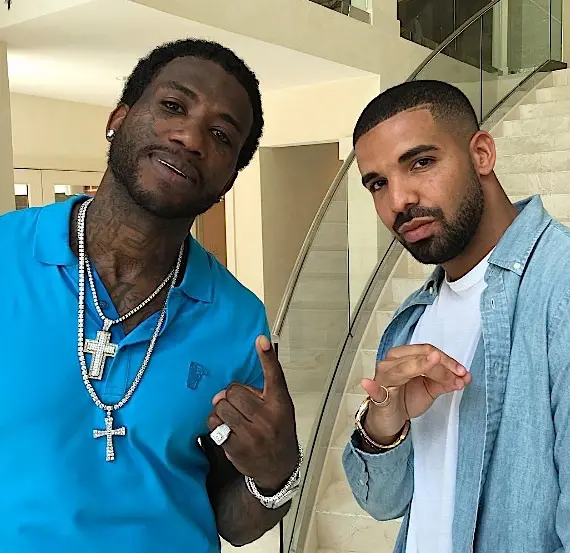 Gucci Mane and Drake pose, while shooting a new video.